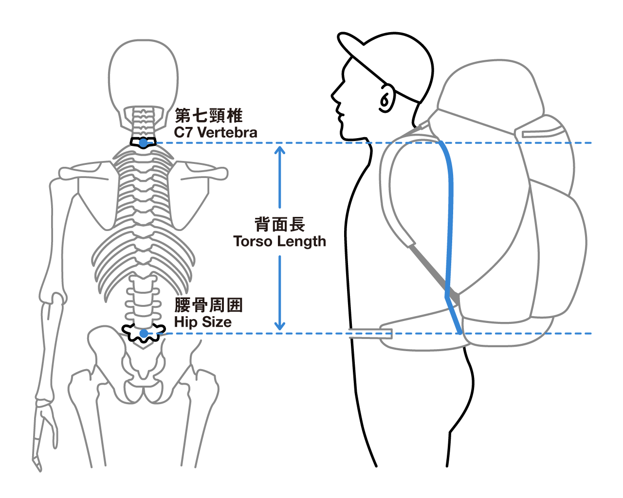 *背面長とは背骨の長さです。山と道では首の第七頚椎から腰骨の高さまでを指します。