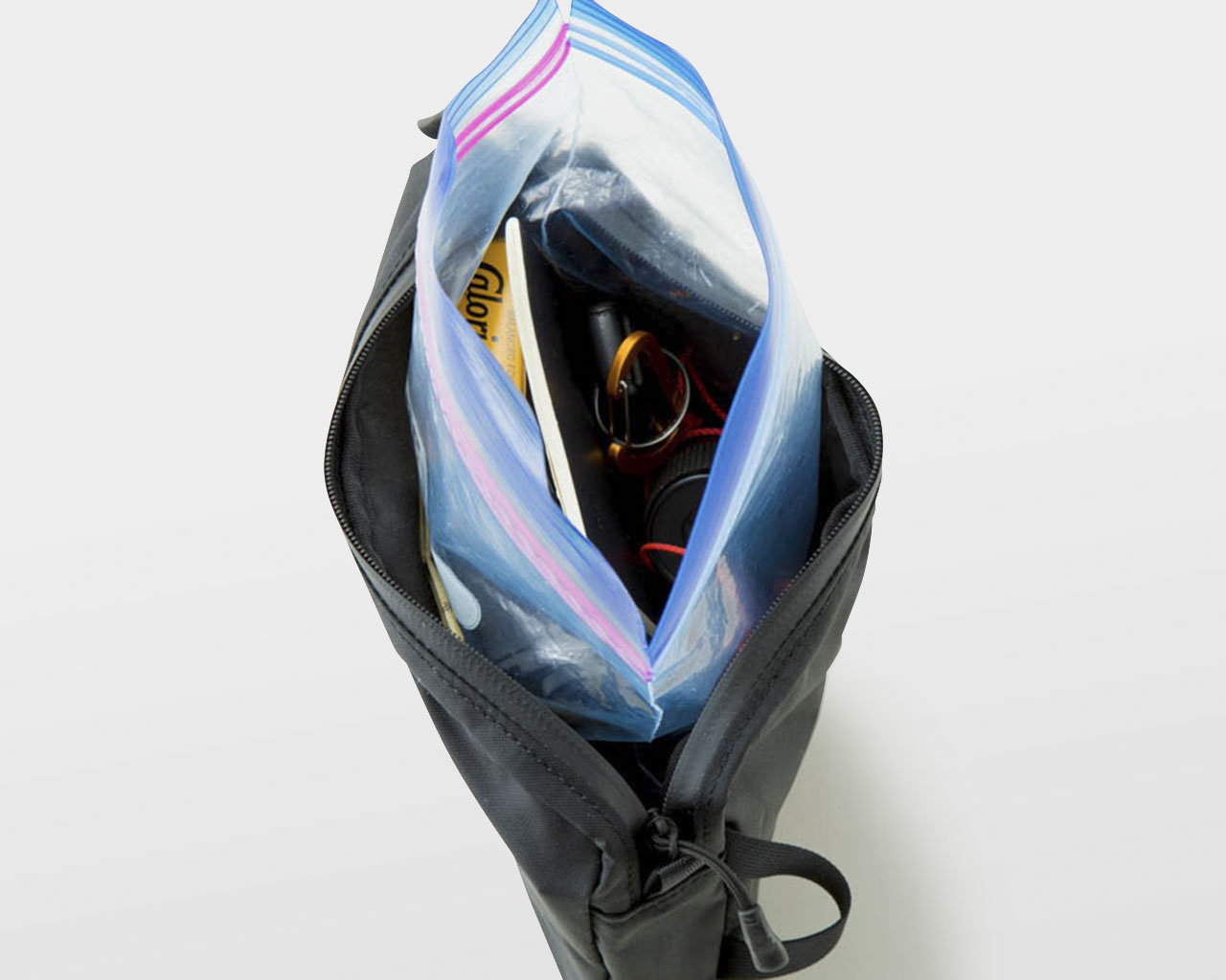 山と道スタッフはサコッシュと併用し、すぐに取り出すものはサコッシュに、手袋やヘッドライトなどときどき使うものや行動食の予備、エマージェンシーキットなどをZip Packに入れています。