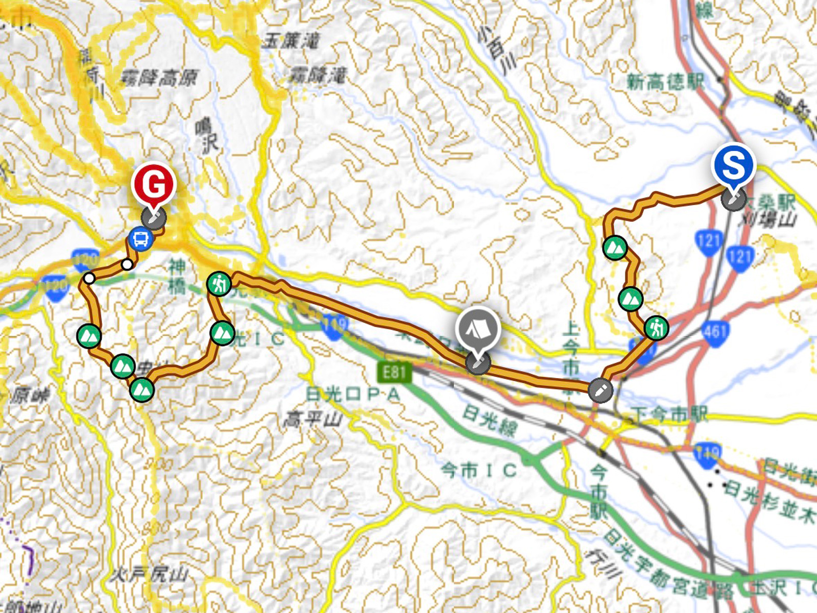 【1日目】大桑駅(10:15/集合)〜大桑登山口〜毘沙門山〜茶臼山〜大谷橋〜日光だいや川公園オートキャンプ場 ※ワークショップを含む行動約4時間