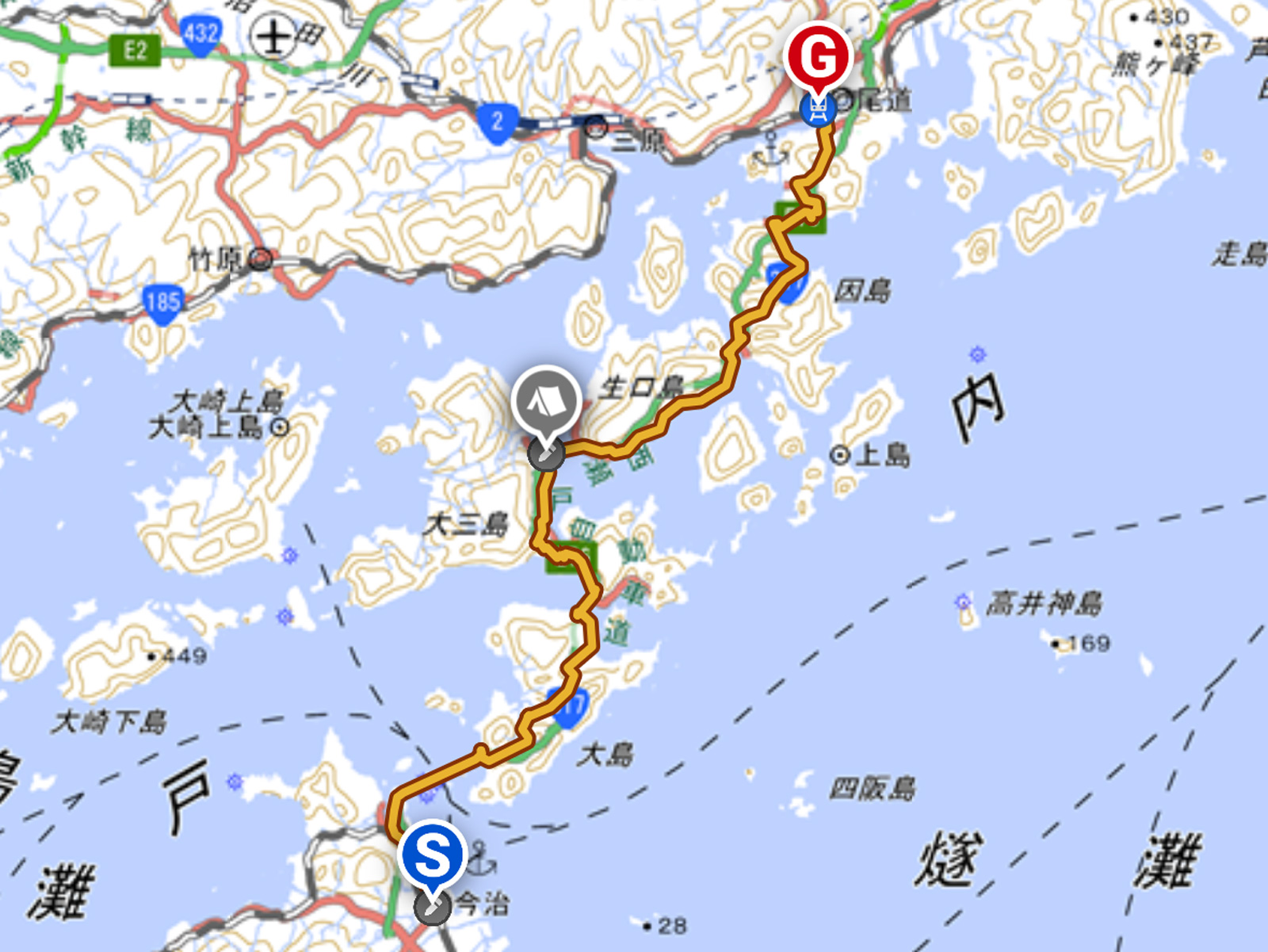 【1日目】今治駅(7:00/集合)~大島~伯方島~大三島~多々羅キャンプ場 ※行動約8時間