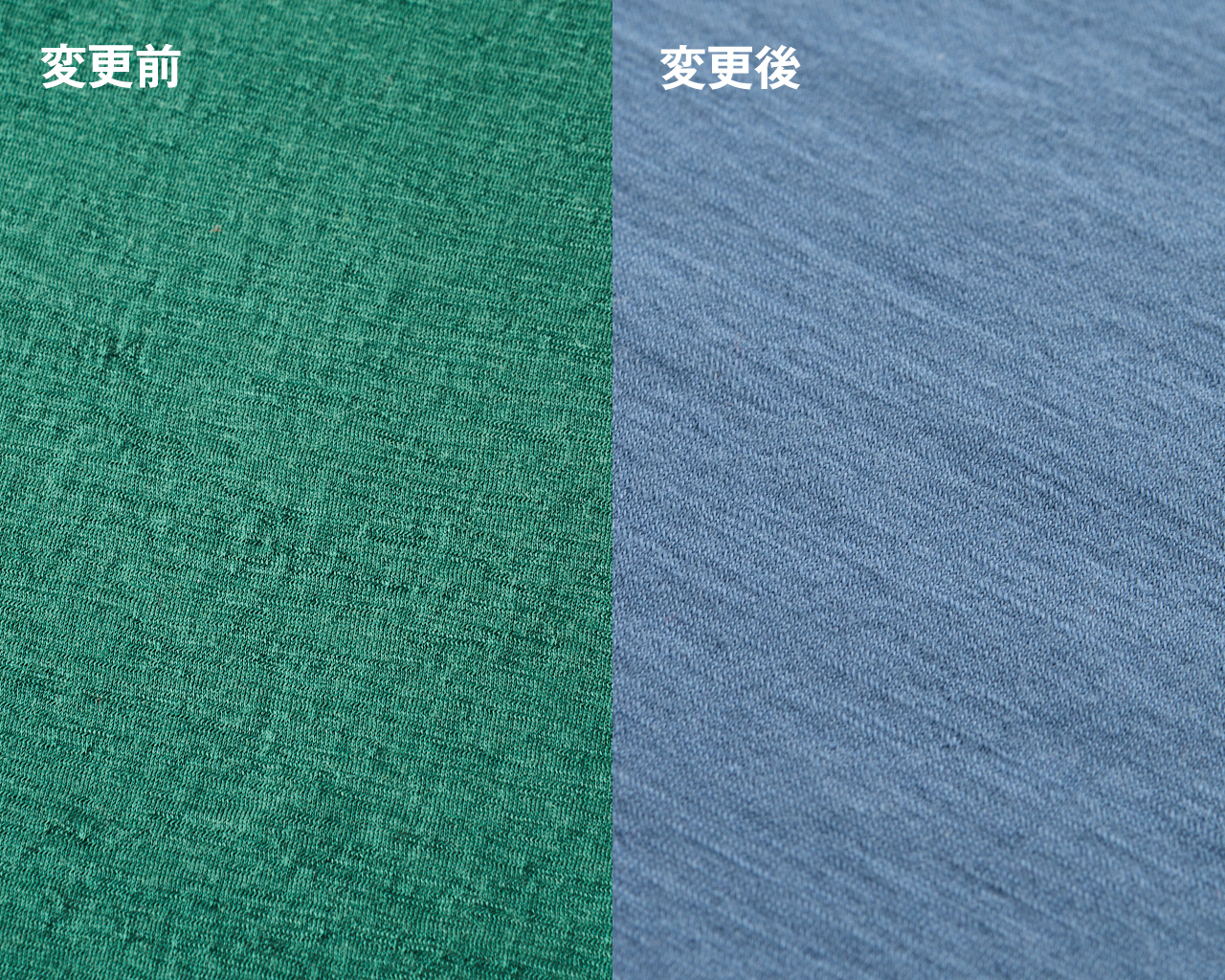 染色方法を、糸の段階で染める「糸染め」から生地に織り上げてから染める「反染め」に見直し、生地表面の凹凸を抑制しました。