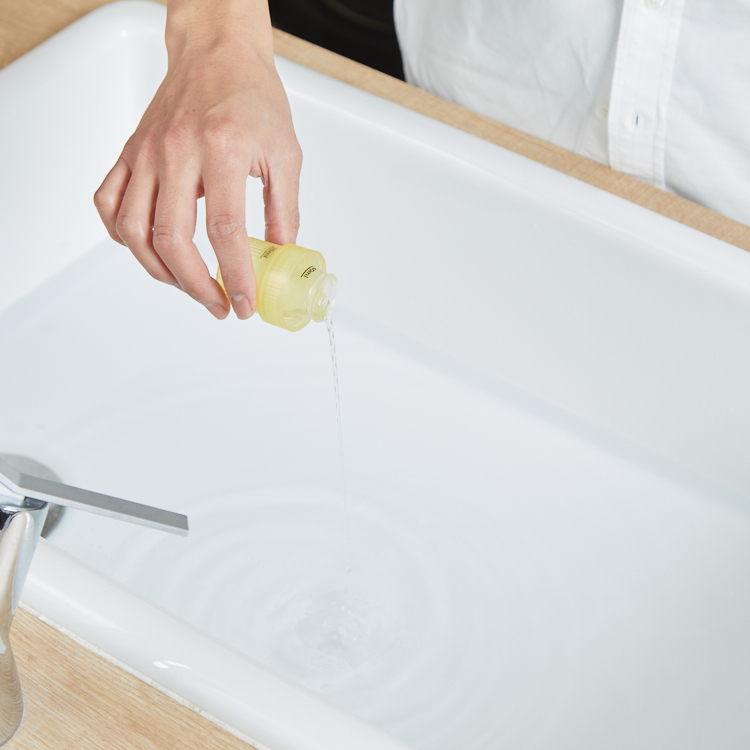 2. 製品が入る大きさのたらいやシンク、浴槽に60℃以下のぬるま湯をはり、中性洗剤を適量入れてください。すすぎ残しに繋がるため、洗剤を入れすぎないようにしてください。